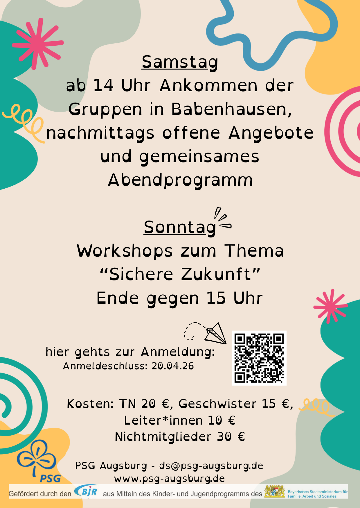 Der Höhepunkt der Aktion "Move togehter", die über Insta läuft, soll unser diesjähriges Diözesanwochenende sein. Dort laufen wir alle zusammen als Diözese Augsburg für das Thema „sichere Zukunft“ zum Zeltplatz nach Babenhausen. Es findet am 9.5.- 10.5.26 statt – bis dahin könnt ihr euch mit eurer Gruppe/eurem Stamm für ein Unterthema von „sicherer Zukunft“ entscheiden, für das ihr an diesem Wochenende laufen wollt. Einen Vorschlag, wie ihr das machen könnt, findet ihr weiter unten bei den Gurppenstundenideen