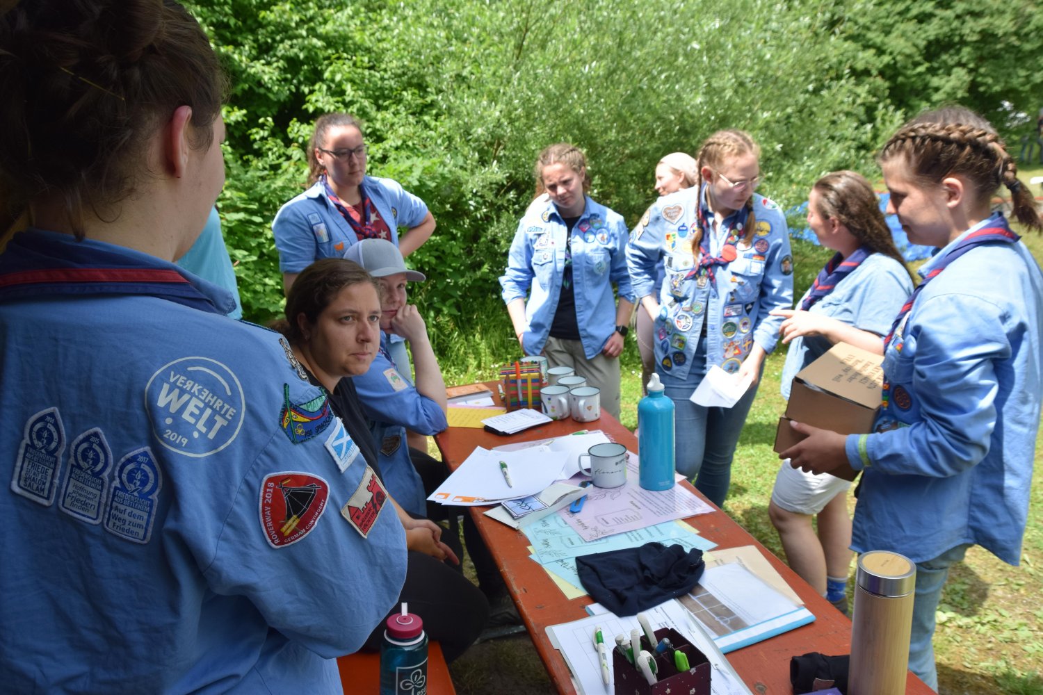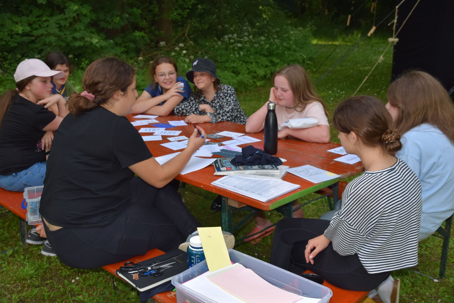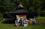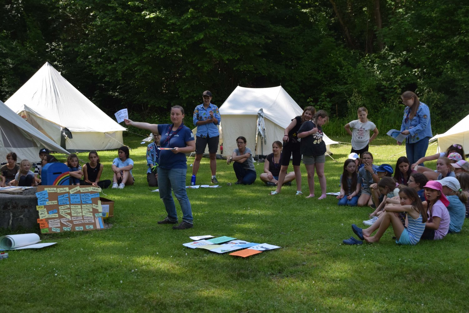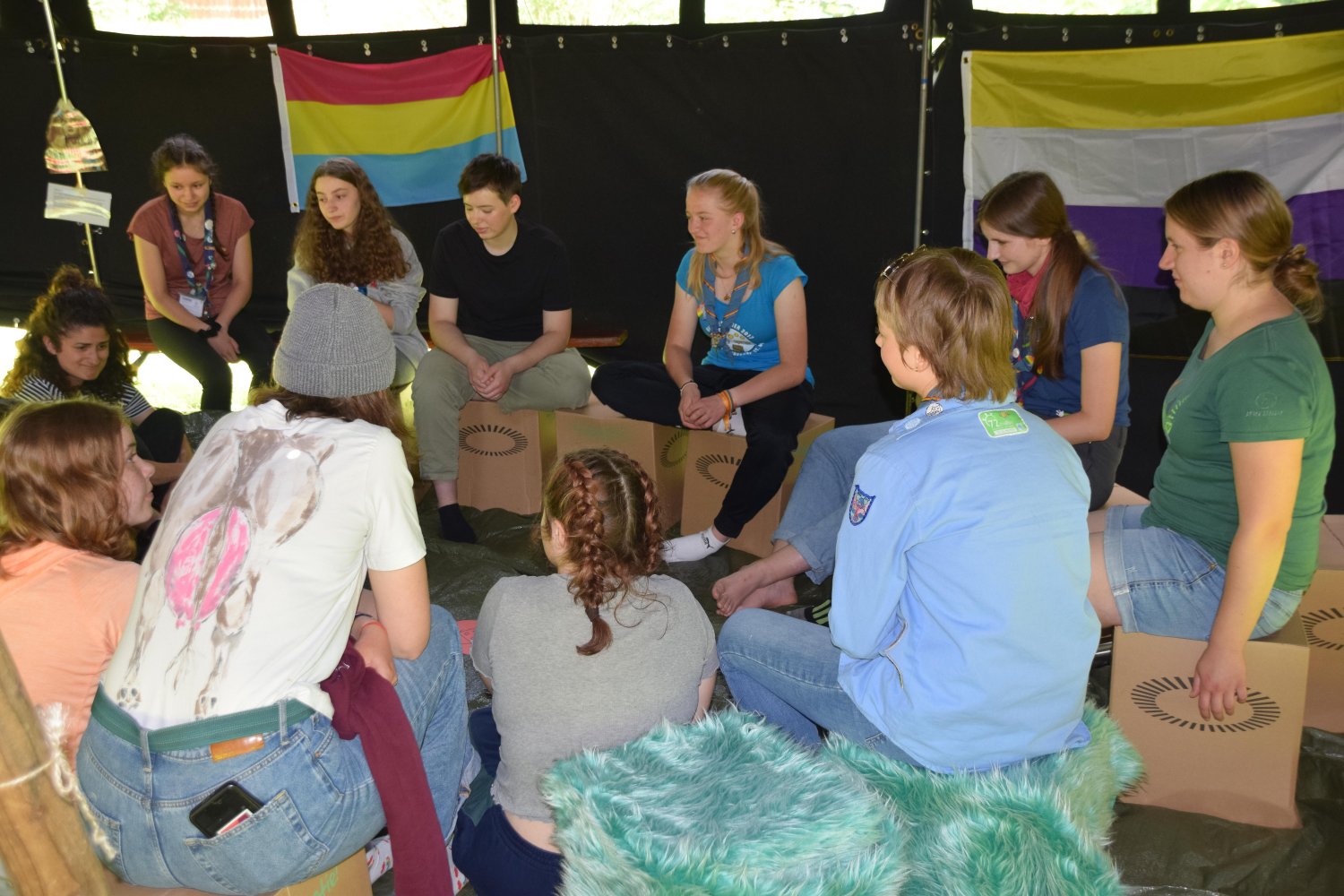 Im Regenbogenzelt fand auch der ReBoRa (Regenbogenrat) statt, an dem Pfadfinderinnen* allen Alters teilnehmen konnten, um ihre Meinungen, Wünsche und Bedürfnisse zu äußern. Gleichberechtigt mit den Leiterinnen* konnten sich alle austauschen, diskutieren und Kompromisse schließen. So konnten wir die basisdemokratischen Strukturen unseres Verbands auch auf dem Lager aufrechterhalten und allen Teilnehmerinnen* eine Stimme geben.